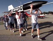 Fired Up Members of Tripoli Oklahoma carry their homemade rocket after running some tests at Wiley Post Airport. The hobbyists plan to launch the rocket Sunday in Kansas. Staff Photo by Bryan Terry |